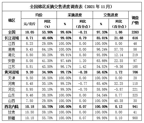 按照被調(diào)查棉農(nóng)預計產(chǎn)量及采摘量、交售量計算,截至11月30日,全國棉花采摘進度為99.7%,同比慢0.2個百分點;交售進度為97.3%,同比快1.9個百分點。全國棉花平均交售價10.1元/公斤,同比上漲53.9%,環(huán)比下跌4.7%。