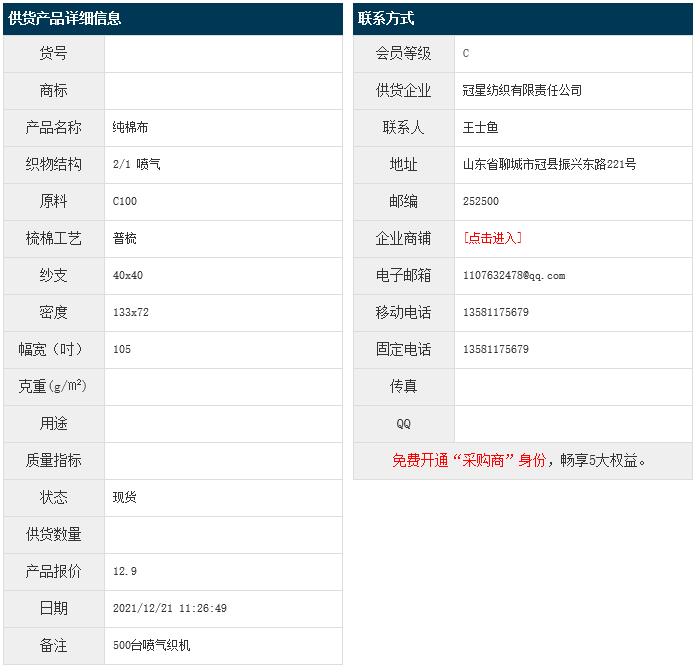 12月21日,冠星紡織有限責(zé)任公司純棉布C100 40x40 133x72 105" 2/1 噴氣,報(bào)價(jià)為12.9元/米,實(shí)際成交價(jià)以協(xié)商為準(zhǔn)。[點(diǎn)擊查看詳情]