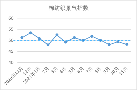 11月,中國棉紡織景氣指數(shù)48.20,較10月下降1.19,低于枯榮線,行業(yè)景氣度繼續(xù)下降。從分類指數(shù)看,在構(gòu)成中國棉紡織景氣指數(shù)的7個(gè)分類指數(shù)中,原料采購指數(shù)、原料庫存指數(shù)、生產(chǎn)指數(shù)、產(chǎn)品銷售指數(shù)、產(chǎn)品庫存指數(shù)、經(jīng)營指數(shù)、企業(yè)信心指數(shù)均位于枯榮線下方。