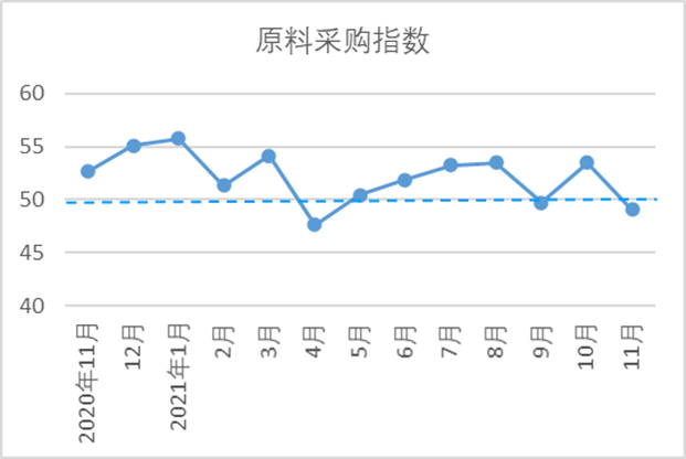 11月,原料采購指數(shù)49.06,較10月下降4.43,低于枯榮線。從價(jià)格看,受下游需求轉(zhuǎn)弱、新型變異毒株出現(xiàn)等因素影響,原料價(jià)格出現(xiàn)下跌。整體看,國內(nèi)外棉價(jià)和主流粘膠月均價(jià)高于10月,滌綸短纖月均價(jià)低于10月。具體數(shù)據(jù),CotlookA指數(shù)月平均值126.54美分/磅,環(huán)比上漲9.16美分/磅,漲幅7.8%;3128級(jí)棉花月均價(jià)22819元/噸,環(huán)比上漲443元/噸,漲幅1.98%;1.4D直紡滌綸短纖月均價(jià)7180元/噸,環(huán)比下降800元/噸,降幅10.02%;主流粘膠纖維月均價(jià)14159元/噸,環(huán)比上漲432元/噸,漲幅3.15%。從采購量看,棉花采購量指數(shù)繼續(xù)下降,非棉纖維采購量指數(shù)較10月上升??梢钥闯?,滌綸短纖價(jià)格下降及棉花采購量減少拉低原料采購指數(shù)。
