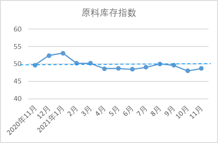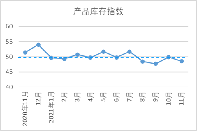 11月,原料庫存指數(shù)48.7,較10月上升0.7,低于枯榮線。11月以來,儲(chǔ)備棉繼續(xù)投放,引導(dǎo)國內(nèi)棉市平穩(wěn)運(yùn)行,新棉高價(jià)難以傳導(dǎo),部分貿(mào)易商降價(jià)銷售,棉紡織企業(yè)剛需采購棉花。非棉纖維方面,價(jià)格呈下降趨勢,企業(yè)適時(shí)補(bǔ)庫。當(dāng)月棉花庫存量指數(shù)47.37,低于枯榮線;非棉纖維庫存量指數(shù)50.02,高于枯榮線。棉價(jià)持續(xù)高位而非棉纖維價(jià)格相對(duì)低位,從成本及風(fēng)險(xiǎn)控制因素考慮,企業(yè)使用非棉纖維意愿更強(qiáng)。