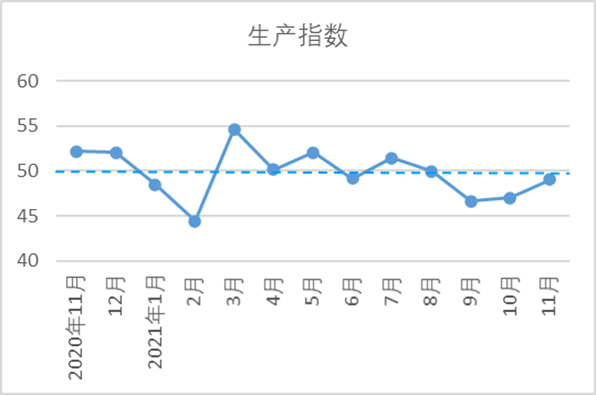 11月,生產(chǎn)指數(shù)49.02,較10月上升2.03,低于枯榮線。當(dāng)月,企業(yè)生產(chǎn)基本恢復(fù)正常,開機(jī)率有所提高,大中型企業(yè)開機(jī)率多在90%以上,11月棉紡織企業(yè)開機(jī)/臺(tái)率指數(shù)49.58,較10月上升2.88。從生產(chǎn)看,紗產(chǎn)量指數(shù)48.44,較10月上升0.93,布產(chǎn)量指數(shù)48.50,較10月上升1.51。可以看出紗、布產(chǎn)量指數(shù)均較10月上升,布產(chǎn)量指數(shù)增幅高于紗產(chǎn)量指數(shù),但2個(gè)指數(shù)值仍低于枯榮線。