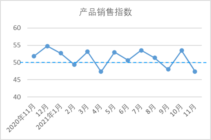 11月,產(chǎn)品銷售指數(shù)47.41,較10月下降6.07。從價(jià)格看,中上旬紗布價(jià)格穩(wěn)中有降,下旬降幅開始擴(kuò)大,其中棉紗價(jià)格降幅高于坯布。具體看,32支純棉普梳紗月均價(jià)29202元/噸,環(huán)比下跌194元/噸,降幅0.66%,純棉坯布(32*32130*702/147"斜紋)月均價(jià)6.54元/米,環(huán)比下跌0.02元/米,降幅0.30%。從銷量看,紗布銷售量均較10月下降,其中坯布銷售量下降幅度高于紗線。當(dāng)月紗銷售量指數(shù)47.37,較10月下降0.68;布銷售量指數(shù)47.6,較10月下降1.01。