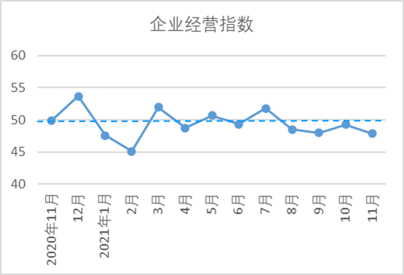 11月,企業(yè)經(jīng)營指數(shù)47.88,較10月下降1.38。隨著企業(yè)用電壓力緩解,用電成本有所上升,尤其中小企業(yè)紡紗成本出現(xiàn)大幅上漲,紗布價(jià)格弱勢下行,導(dǎo)致利潤持續(xù)下降,虧損企業(yè)數(shù)量有所增加。出口型企業(yè)表示當(dāng)前海運(yùn)費(fèi)用依然高企,企業(yè)處虧損狀態(tài),經(jīng)營壓力較大。11月,主營業(yè)務(wù)收入指數(shù)48.3,較10月下降2.01;利潤總額指數(shù)47.46,較10月下降0.75,主營業(yè)務(wù)收入指數(shù)下降幅度高于利潤總額。