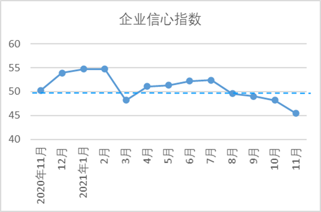 11月,企業(yè)信心指數(shù)45.45,較10月下降2.76,為今年以來最低值。當(dāng)前,全球通脹持續(xù)上升,疫情反復(fù)暴發(fā),毒株更新迭代,擾亂全球供應(yīng)鏈周期,阻礙著全球經(jīng)濟(jì)復(fù)蘇前路。我國經(jīng)濟(jì)雖繼續(xù)保持恢復(fù)態(tài)勢,但制約因素仍較多。近期部分紡織大省出現(xiàn)疫情,一些企業(yè)宣布臨時(shí)停產(chǎn)。臨近年底,資金回籠、安全生產(chǎn)、疫情防控將是企業(yè)的主要目標(biāo),對(duì)于后市,多數(shù)企業(yè)持謹(jǐn)慎態(tài)度。調(diào)查數(shù)據(jù)顯示,認(rèn)為后市樂觀向好的企業(yè)占比為9.7%,認(rèn)為后市弱勢下行的企業(yè)占比為55.18%。