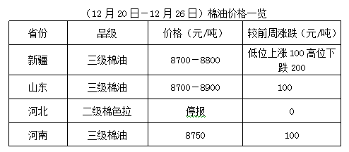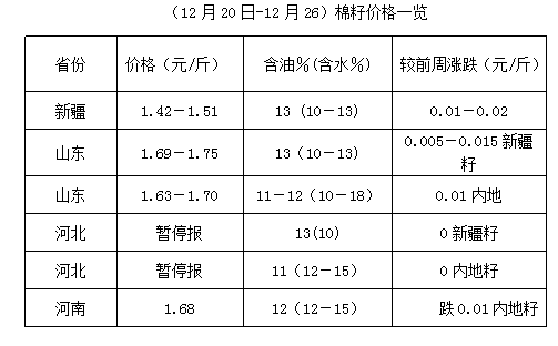 上周棉籽價格保持弱勢,成交少量。油棉廠因經(jīng)營利潤不佳,收購棉籽積極性下降,部分企業(yè)根據(jù)行情少量收購,配合前期庫存棉籽,維持正常開機,個別廠家停收,觀市而為。元旦來臨,氣溫大幅下降,新疆棉籽運到內(nèi)地難度加大,如果下游棉副產(chǎn)品價格不能支撐,成交仍難放量。