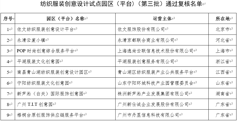 根據(jù)《工業(yè)和信息化部關(guān)于印發(fā)<紡織服裝創(chuàng)意設(shè)計(jì)試點(diǎn)示范園區(qū)(平臺)管理辦法(試行)>的通知》(工信部消費(fèi)〔2016〕396號)要求,經(jīng)園區(qū)(平臺)自愿申報、省級工業(yè)和信息化主管部門推薦、專家評審和網(wǎng)上公示等程序,確定紡織服裝創(chuàng)意設(shè)計(jì)示范園區(qū)(平臺)名單(第一批)和紡織服裝創(chuàng)意設(shè)計(jì)試點(diǎn)園區(qū)(平臺)(第三批)通過復(fù)核名單?,F(xiàn)予公告。