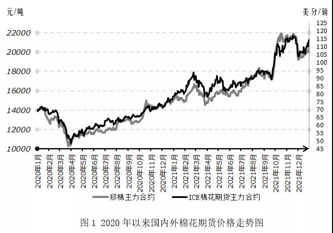 12月以來,國內(nèi)新棉銷售依舊困難,紡織市場弱勢未改,上下游持續(xù)僵持,“奧密克戎”變異毒株觸發(fā)棉價大跌,隨著國際市場情緒暫時回暖,國內(nèi)棉價重挫后隨大宗商品走勢小幅抬升。截至2021年12月底,鄭州商品交易所棉花期貨主力合約結算價20002元/噸,較11月均價下跌811元/噸,跌幅3.90%;代表內(nèi)地標準級皮棉市場價格的國家棉花價格B指數(shù)21145元/噸,較11月基本持平。
