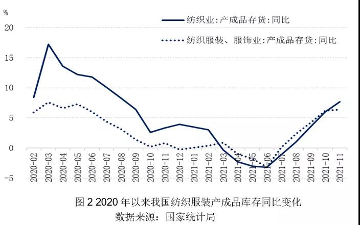 據(jù)國家統(tǒng)計局數(shù)據(jù)顯示,服裝產(chǎn)成品庫存自2021年7月開始上升,同比由降轉增,8月逐漸傳導到紡織業(yè)成品庫存增加(如圖2),產(chǎn)業(yè)鏈庫存壓力自下而上傳導。據(jù)中國棉花網(wǎng)調(diào)查,約9成企業(yè)訂單在春節(jié)前結束,大幅少于去年同期,美國立法制裁新疆棉進一步打壓市場信心,紡織企業(yè)紛紛提前放假避險,計劃延長春節(jié)放假時間紡企超過50%,將進一步加劇新棉銷售困難的局面。