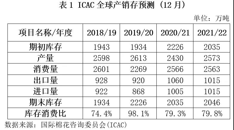 國際棉花咨詢委員會(ICAC)12月全球棉花產(chǎn)銷存預測數(shù)據(jù)顯示,2021/22年度全球棉花期初庫存2035萬噸,同比下降191萬噸,降幅8.58%;全球棉花產(chǎn)量2573萬噸,同比增加143萬噸,增幅5.88%;消費量2563噸,同比下降3萬噸,降幅0.12%;期末庫存2046萬噸,同比增加11萬噸,增幅0.54%;全球棉花產(chǎn)大于需10萬噸,扭轉2020/22年度產(chǎn)不足需局面;全球棉花期末庫存消費比為79.8%,較2020/21年度上升0.5百分點。