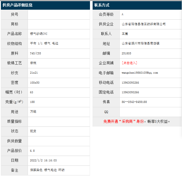 1月2日,山東陽信縣信王紡織有限公司滌棉紗絹CVC55/45 21x21 100x50 63" 188g/㎡ 噴氣 毛邊,報價為6.8元/米,實際成交價以協(xié)商為準。[點擊查看詳情]