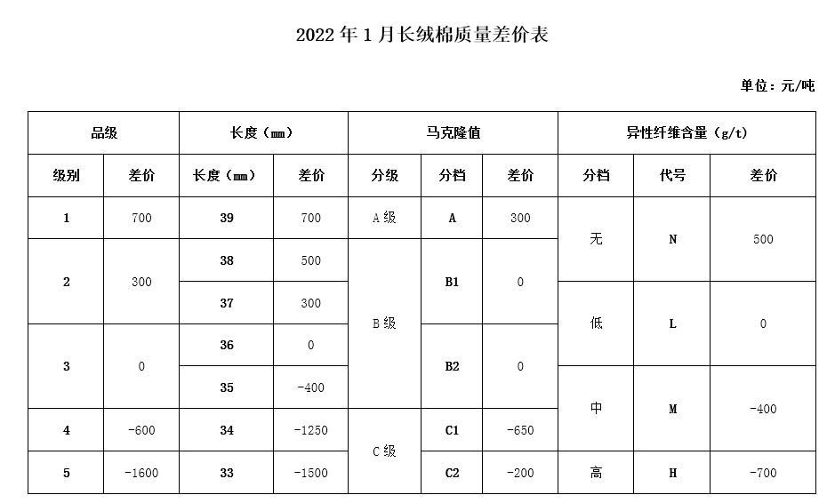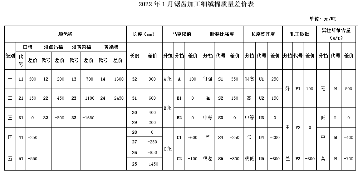 根據(jù)《中國(guó)棉花協(xié)會(huì)國(guó)產(chǎn)棉質(zhì)量差價(jià)表管理辦法》規(guī)定,現(xiàn)正式發(fā)布2022年1月《鋸齒加工細(xì)絨棉質(zhì)量差價(jià)表》、《皮輥加工細(xì)絨棉質(zhì)量差價(jià)表》和《長(zhǎng)絨棉質(zhì)量差價(jià)表》(單位:元/噸)。