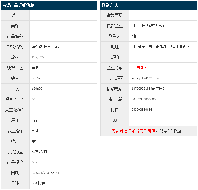 1月7日,四川玉揚(yáng)紡織有限公司滌棉魚骨紋T65/C35 32x32 130x70 63" 噴氣 毛邊,報(bào)價(jià)為6.5元/米,實(shí)際成交價(jià)以協(xié)商為準(zhǔn)。[點(diǎn)擊查看詳情]
