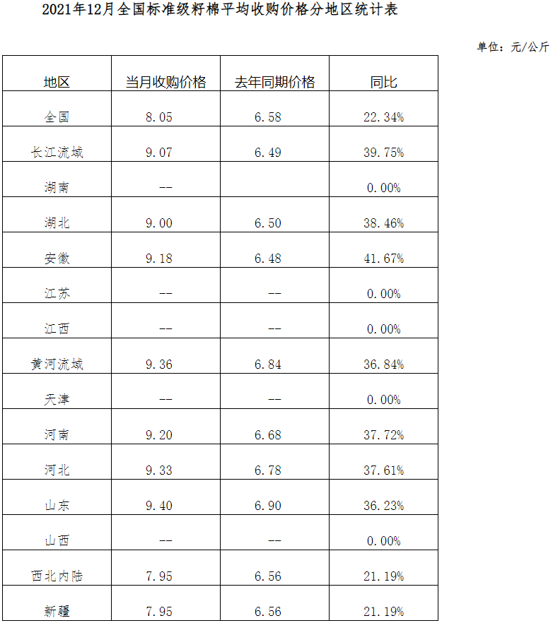 12月,新棉收購進(jìn)入尾聲,收購價大幅回落。全國400型棉花加工企業(yè)3128級籽棉平均收購價僅8.1元/公斤,同比上漲22.3%,環(huán)比下跌18.1%。其中新疆籽棉收購價8.0元/公斤,同比上漲21.3%,環(huán)比下跌20.9%;長江流域籽棉收購價9.1元/公斤,同比上漲39.8%,環(huán)比下跌8.0%;黃河流域收購價9.4元/公斤,同比上漲36.8%,環(huán)比下跌7.1%。月內(nèi)收購加工企業(yè)已將重心轉(zhuǎn)移到皮棉銷售上,但市場價格低于收購加工成本,造成各軋花廠積壓滯銷,現(xiàn)貨銷售率僅13%左右,較去年下降20個百分點(diǎn)。