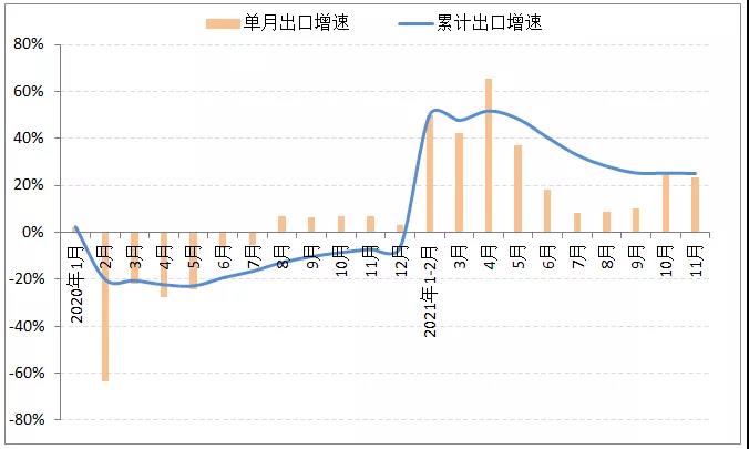11月在國際市場需求增加和為圣誕季促銷備貨等因素的持續(xù)拉動下,我國服裝出口延續(xù)大幅增長態(tài)勢,單月出口同比增長23.2%。據(jù)中國海關(guān)數(shù)據(jù),2021年1-11月我國累計完成服裝及衣著附件出口1543.5億美元,同比增長25.1%,2年平均增長7.7%,2年平均增速比1-10月提高0.7個百分點。其中針織服裝及衣著附件出口增勢強勁,出口金額782.14億美元,同比增長39.88%,2年平均增長9.5%;機織服裝及衣著附件出口保持穩(wěn)定增長,金額633.82億美元,同比增長12.28%,2年平均增長2.57%。