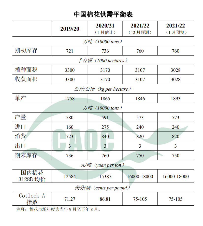 棉花:據(jù)國(guó)家統(tǒng)計(jì)局公告,2021年中國(guó)棉花播種面積3028千公頃,比上年下降4.4%;單位面積產(chǎn)量每公頃1893公斤,每公頃產(chǎn)量比上年增長(zhǎng)1.5%;總產(chǎn)量573萬(wàn)噸,比上年下降3.0%。2021/22年度棉花產(chǎn)量預(yù)測(cè)數(shù)據(jù)與國(guó)家統(tǒng)計(jì)局公告基本一致,種植面積和單產(chǎn)預(yù)測(cè)數(shù)據(jù)根據(jù)公告進(jìn)行調(diào)整,其他供需預(yù)測(cè)數(shù)據(jù)與上月保持一致。據(jù)國(guó)家棉花市場(chǎng)監(jiān)測(cè)系統(tǒng)數(shù)據(jù),截至2022年1月6日,全國(guó)新棉采摘已結(jié)束,交售率為99.0%,同比提高0.3個(gè)百分點(diǎn),加工率和銷(xiāo)售率分別為92.7%和22.1%,同比分別下降3.8和25.5個(gè)百分點(diǎn)。全國(guó)新棉質(zhì)量較上一年度有明顯提升,據(jù)中國(guó)纖維質(zhì)量監(jiān)測(cè)中心數(shù)據(jù),全國(guó)新棉的長(zhǎng)度級(jí)、馬克隆值、斷裂比強(qiáng)度等質(zhì)量指標(biāo)均比上年有大幅提高。