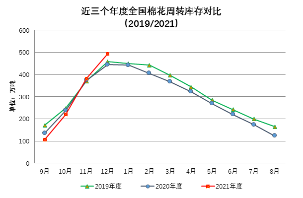 12月全國(guó)棉花加工量和上市資源量持續(xù)增加,資源供應(yīng)充足。紡織企業(yè)因下游需求不暢,新增訂單較少,開(kāi)機(jī)不足,對(duì)棉花需求依然偏弱。月末國(guó)內(nèi)棉花周轉(zhuǎn)庫(kù)存大幅增加,增幅環(huán)比縮小。據(jù)中國(guó)棉花協(xié)會(huì)棉花物流分會(huì)對(duì)全國(guó)棉花交易市場(chǎng)18個(gè)省市的154家棉花交割和監(jiān)管倉(cāng)庫(kù)的調(diào)查數(shù)據(jù)顯示,12月底全國(guó)棉花周轉(zhuǎn)庫(kù)存總量約494.15萬(wàn)噸,環(huán)比增加112.22萬(wàn)噸,增幅較上月縮小,高于去年同期49.66萬(wàn)噸。