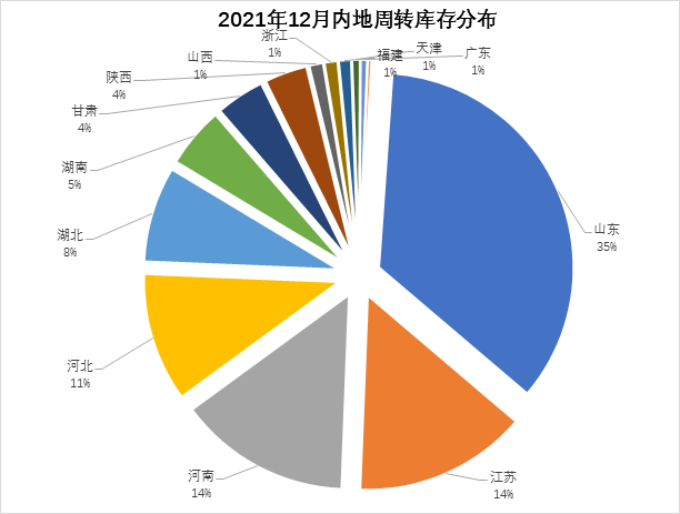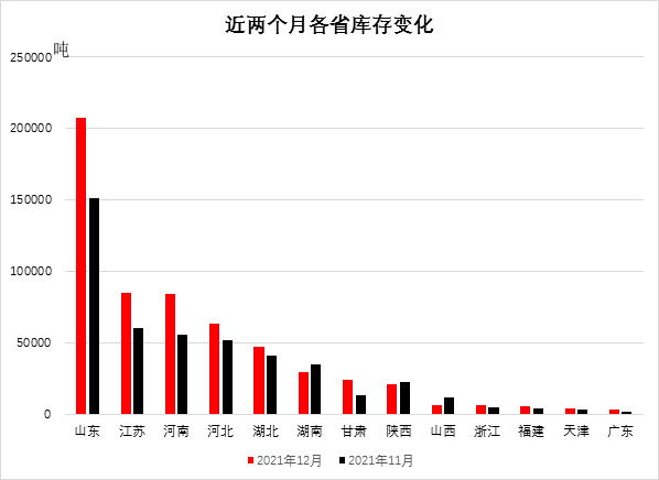 分省份看,山東省庫(kù)存量居首位為20.73萬(wàn)噸,江蘇省次之為8.50萬(wàn)噸,河南省居第三位為8.46萬(wàn)噸,河北省為6.33萬(wàn)噸,湖北省為4.70萬(wàn)噸,湖南省2.97萬(wàn)噸,甘肅省為2.39萬(wàn)噸,陜西省2.09萬(wàn)噸;其他省均在1萬(wàn)噸以下。