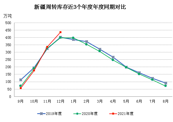 截至12月底,新疆43家倉(cāng)庫(kù)商品棉周轉(zhuǎn)庫(kù)存為435.11萬(wàn)噸,環(huán)比增加98.83萬(wàn)噸,增幅環(huán)比縮?。煌仍黾?7.3萬(wàn)噸。