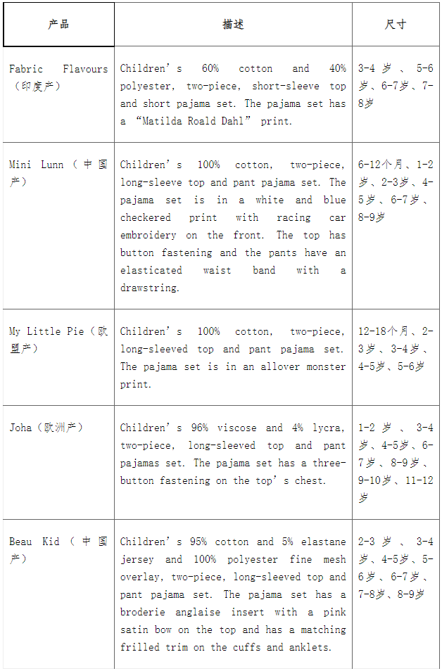 此次召回產(chǎn)品為5款兒童睡衣,包括FabricFlavours、MiniLunn、MyLittlePie、Joha和BeauKid。具體召回產(chǎn)品信息如下:
