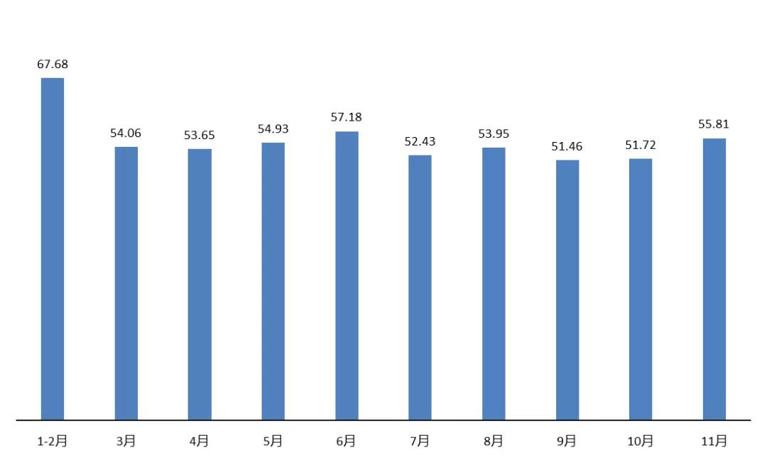 圖1 2021年前11個(gè)月規(guī)上企業(yè)印染布當(dāng)月產(chǎn)量情況(億米)
