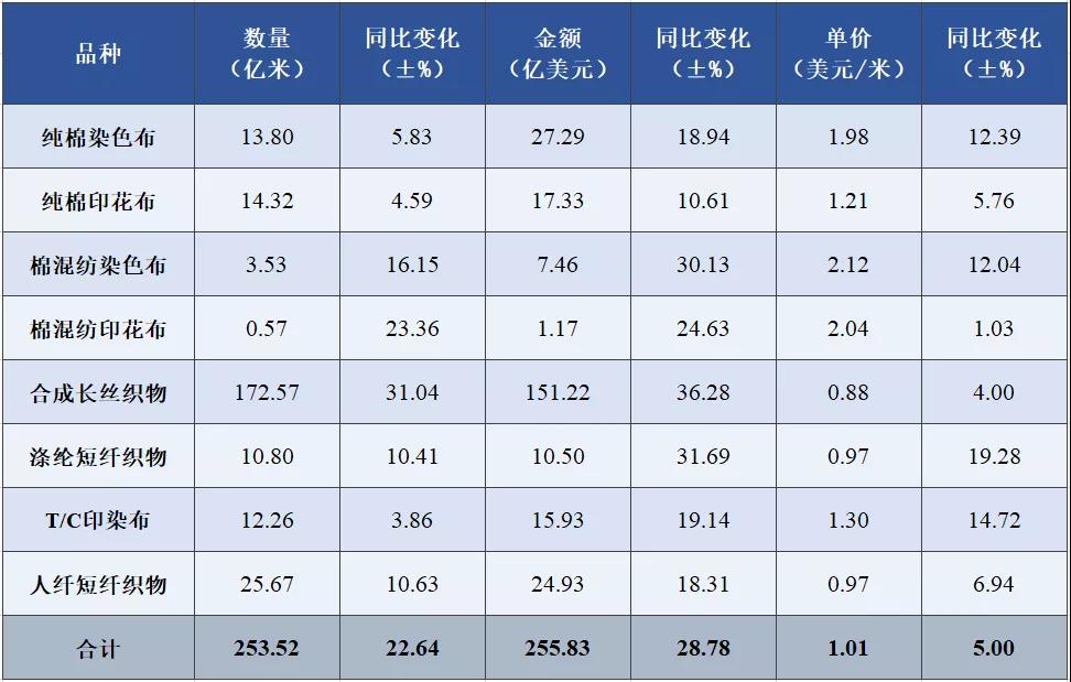 表1 2021年1-11月印染八大類產(chǎn)品出口情況