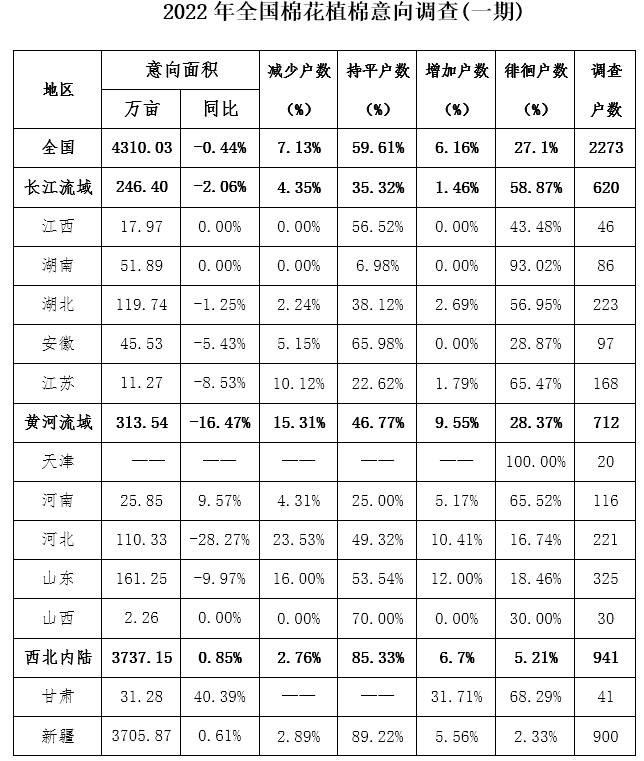 2022年1月,中國(guó)棉花協(xié)會(huì)對(duì)全國(guó)11個(gè)省市和新疆自治區(qū)共2273個(gè)定點(diǎn)農(nóng)戶進(jìn)行2022年首次植棉意向調(diào)查。調(diào)查結(jié)果顯示:2022年全國(guó)植棉意向面積為4310.03萬(wàn)畝,同比減少0.4%,其中西北內(nèi)陸植棉意向增長(zhǎng)0.9%,黃河流域和長(zhǎng)江流域意向分別減少16.5%和2.1%。盡管2021年棉花交售價(jià)上漲,植棉總體收益比2020年大幅增加,但因內(nèi)地棉花種植相對(duì)其他農(nóng)作物費(fèi)工、費(fèi)時(shí)、費(fèi)力,加上補(bǔ)貼政策不精準(zhǔn),棉農(nóng)植棉積極性依然不高,整體植棉意向面積繼續(xù)減少,但降幅較前幾年有所減緩,其中近3成監(jiān)測(cè)戶植棉意向不明,仍在徘徊觀望。