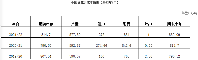 據(jù)中國棉花協(xié)會數(shù)據(jù),2021/22年度全國棉花總產(chǎn)577.4萬噸,同比下降2.5%;預(yù)計進口量約275萬噸;消費量為834萬噸,同比下降1.02%,供需基本平衡。
