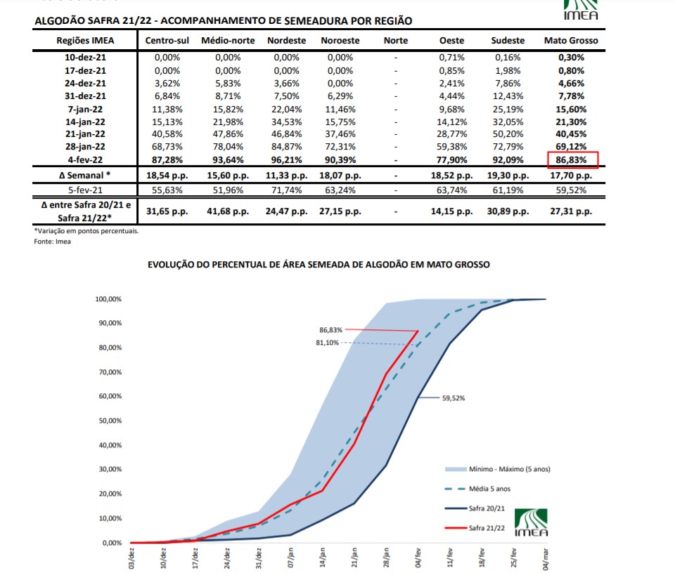 馬托格羅索州農(nóng)業(yè)經(jīng)濟(jì)研究院(IMEA)數(shù)據(jù)顯示,截至2月4日,巴西馬托格羅索州2021/22年度棉花種植進(jìn)度為46.66%,前一周為31.82%,上一年度同期為11.20%,五年均值為33.64%。