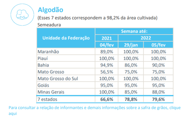 據(jù)巴西農(nóng)業(yè)部下屬的國家商品供應(yīng)公司CONAB,截至2月5日,巴西棉花播種率為79.6%,上周為78.8%,去年同期為66.6%。