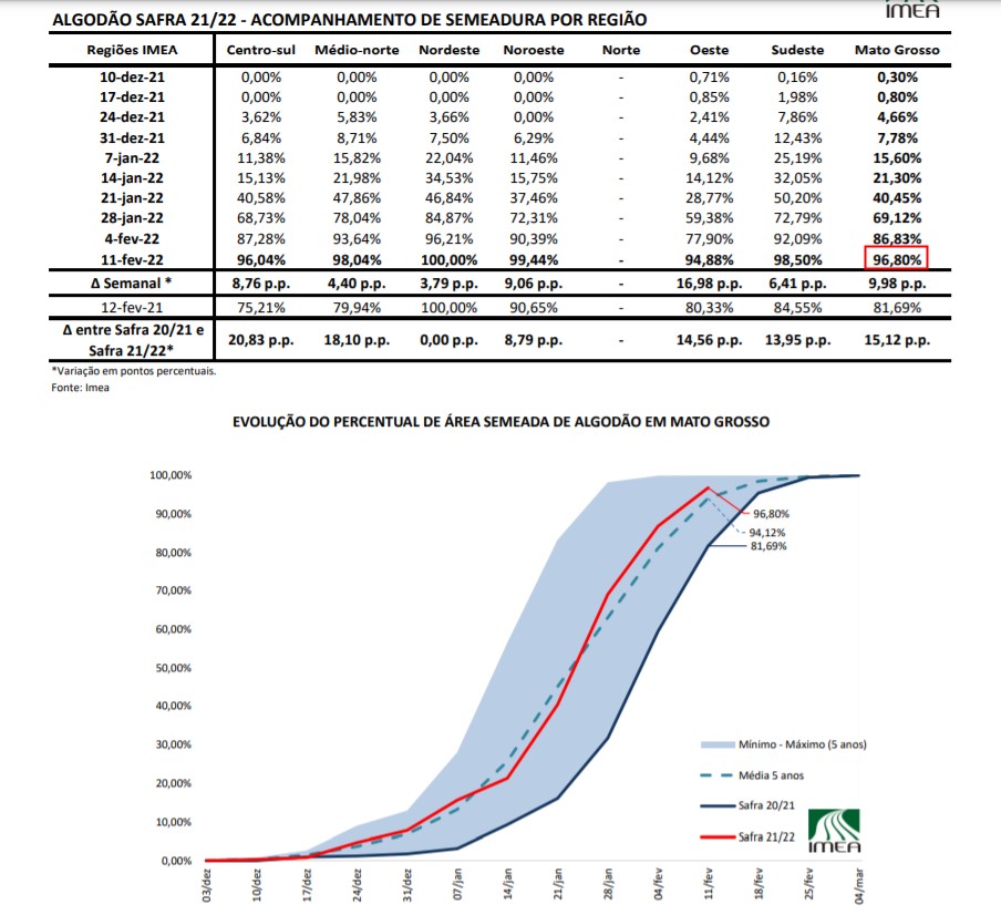 馬托格羅索州農(nóng)業(yè)經(jīng)濟(jì)研究院(IMEA)數(shù)據(jù)顯示,截至2月11日,巴西馬托格羅索州2021/22年度棉花種植進(jìn)度為96.80%,前一周為86.83%,上一年度同期為81.69%,五年均值為94.12%。