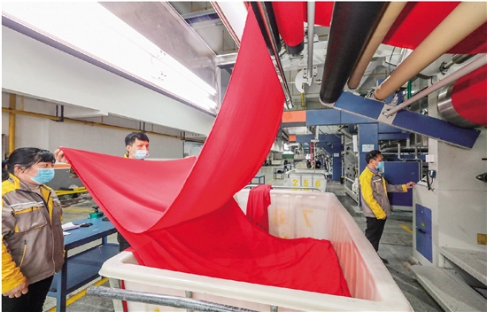 “迎豐股份”新年第一缸紅布從定型機上緩緩落下。