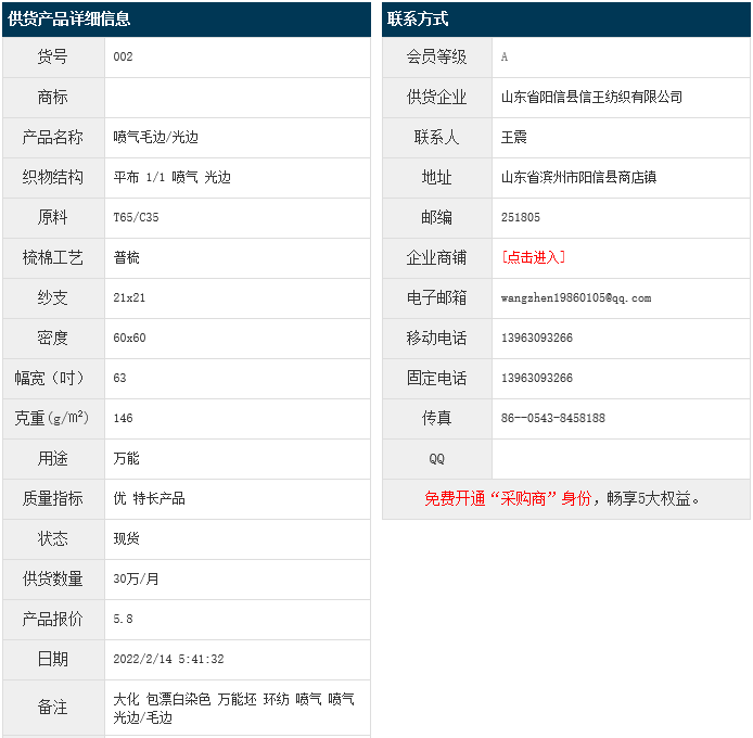 2月12日,山東陽(yáng)信縣信王紡織有限公司大化滌棉平布T65/C35 21x21 60x60 63" 1/1 146g/㎡ 噴氣 毛邊/光邊,報(bào)價(jià)為5.8元/米,實(shí)際成交價(jià)以協(xié)商為準(zhǔn)。[點(diǎn)擊查看詳情]