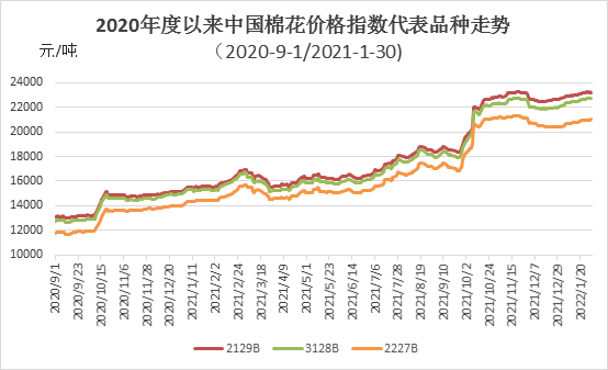 1月,在國內(nèi)大宗商品和期貨上漲帶動下,中國棉花價格指數(shù)穩(wěn)步上漲。月內(nèi),新棉上市資源充足,棉花企業(yè)銷售積極性較高,春節(jié)前紡織企業(yè)開始補庫,需求略有好轉(zhuǎn),但受疫情防控影響,多地區(qū)運輸受阻,棉花購銷總體進度依然較緩慢。月末,中國棉花價格指數(shù)(CCIndex3128B)22717元/噸,環(huán)比上漲610元;月均價22530元/噸,環(huán)比上漲560元,同比上漲7253元。