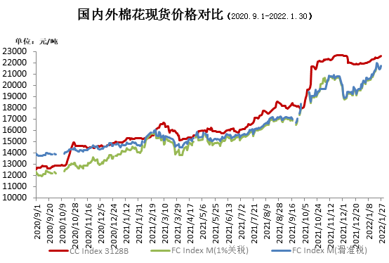 1月,全球大宗商品價格持續(xù)上漲,受此影響,國際棉花期現(xiàn)貨價格較大幅上漲。中國進口棉價格指數(shù)FCIndexM月均134.93美分/磅,環(huán)比上漲11.15美分;月底138.19美分/磅,環(huán)比上漲8.38美分,1%關(guān)稅下折人民幣21570元/噸,低于同期國內(nèi)現(xiàn)貨1157元,內(nèi)外棉價差較上月末縮小589元。