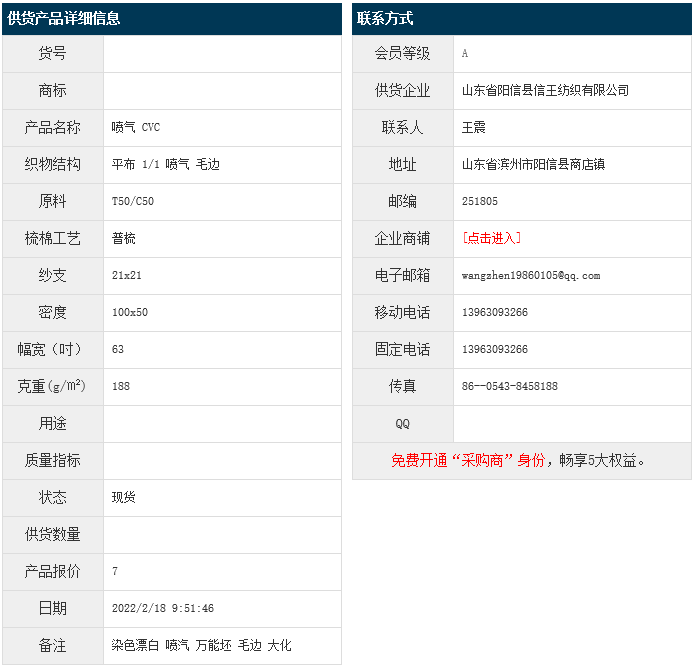 2月18日,山東陽信縣信王紡織有限公司大化滌棉平布CVC50/50 21x21 100x50 63" 1/1 188g/㎡ 噴氣 毛邊,報價為7元/米,實際成交價以協(xié)商為準(zhǔn)。[點擊查看詳情]