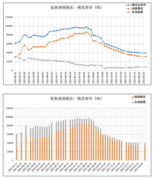 據(jù)張家港保稅區(qū)紡織原料市場統(tǒng)計,2月14日當周,張家港保稅區(qū)棉花總庫存39792.7噸,環(huán)比增加1.68%;其中保稅棉31357.28噸,環(huán)比減少4.23%,非保稅棉8435.39噸,環(huán)比增加9.15%。