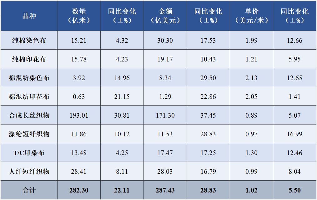 表12021年1-12月印染八大類產(chǎn)品出口情況