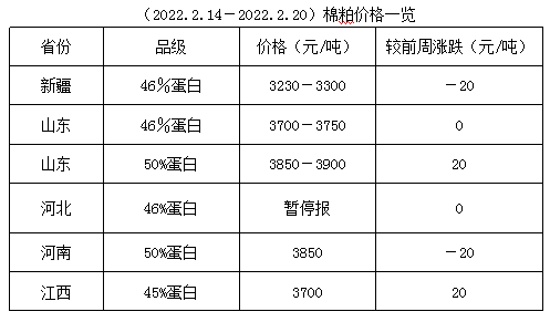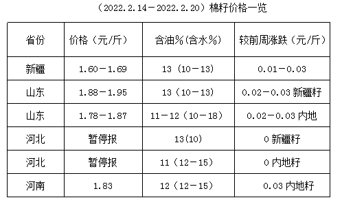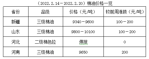 上周(2022年2月14-20日),棉油、棉粕報價有所上漲,棉籽價格高位走強,油棉廠復工率逐步回升,市場購銷緩慢啟動。