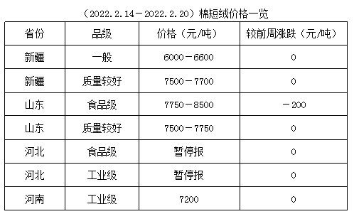 上周,鄭棉高位回落運行,現(xiàn)貨弱勢穩(wěn)定為主,成交觀望。棉籽價格高位難下,油棉廠陸續(xù)收購,開工率有所回升,棉短絨供應量有限,廠家報價穩(wěn)定,個別高價出現(xiàn)下跌。下游化纖廠、精制棉廠少有采購,啟動平緩。未來油棉廠開工率逐步提升,棉短絨供應量增加,行情暫難好轉。