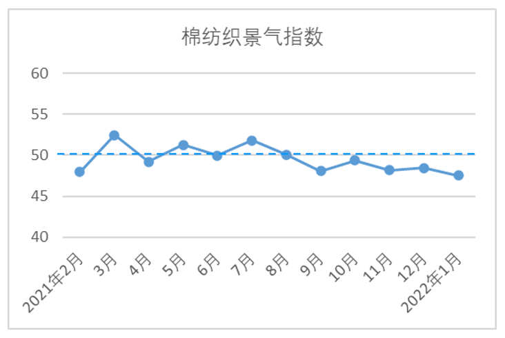 1月,中國(guó)棉紡織景氣指數(shù)47.53,較12月下降0.9,繼續(xù)位于枯榮線下方。從分類指數(shù)看,在構(gòu)成中國(guó)棉紡織景氣指數(shù)的7個(gè)分類指數(shù)中,除原料采購(gòu)指數(shù)和原料庫(kù)存指數(shù)高于枯榮線,生產(chǎn)指數(shù)、產(chǎn)品銷售指數(shù)、產(chǎn)品庫(kù)存指數(shù)、企業(yè)經(jīng)營(yíng)指數(shù)、企業(yè)信心指數(shù)均位于枯榮線下方。