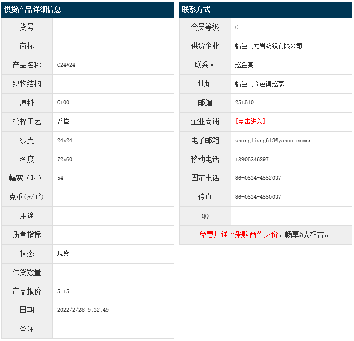 2月28日,臨邑縣龍巖紡織有限公司純棉布C100 24x24 72x60 54",報(bào)價(jià)為5.15元/米,實(shí)際成交價(jià)以協(xié)商為準(zhǔn)。[點(diǎn)擊查看詳情]