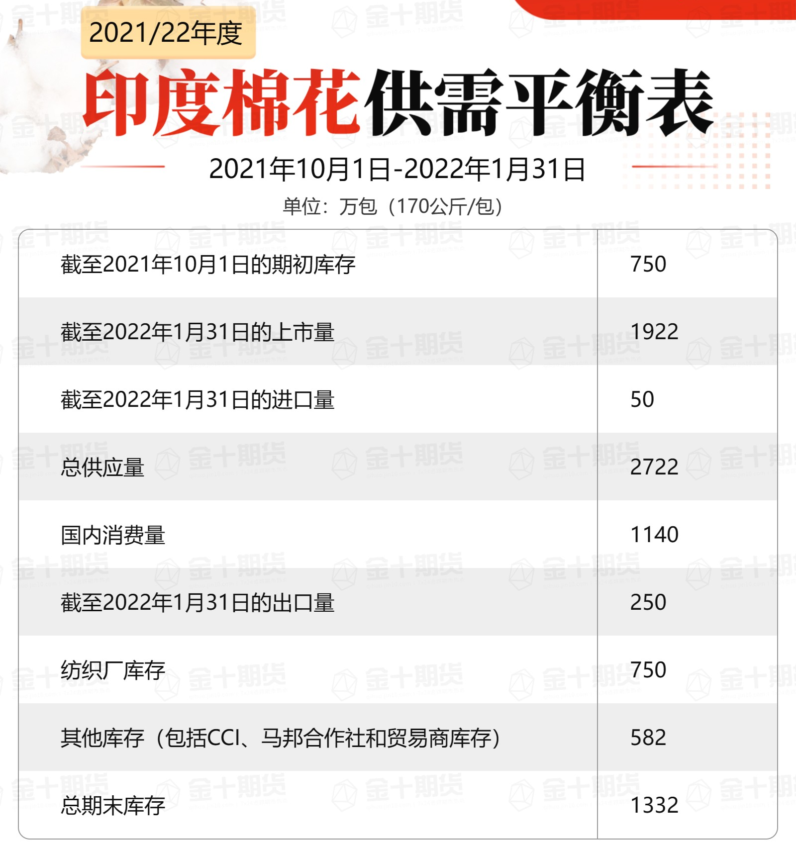 印度棉花協(xié)會(huì)公布最新預(yù)測數(shù)據(jù),印度棉花供應(yīng)總量為2722萬包,其中新棉上市量1922萬包,進(jìn)口量50萬包,期初庫存750萬包;印度國內(nèi)消費(fèi)量為1140萬包,出口量250萬包;期末庫存為1332萬包,其中紡織廠750萬包,其他渠道582萬包(CCI、馬邦合作社和貿(mào)易商庫存)。(注:1包等于170公斤)