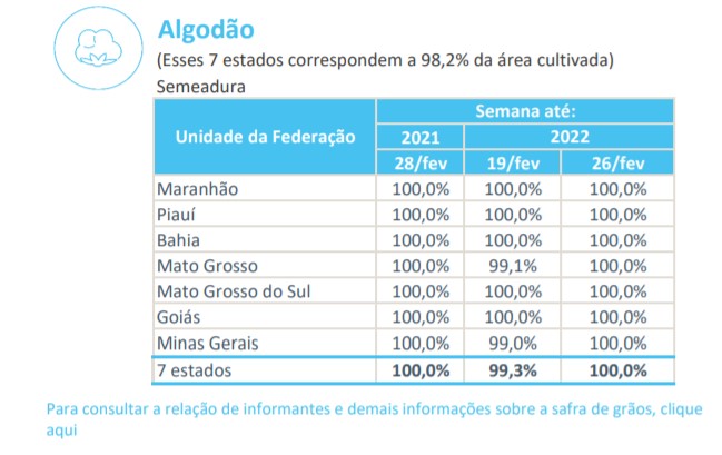 據(jù)巴西農(nóng)業(yè)部下屬的國家商品供應(yīng)公司CONAB,截至2月26日,巴西棉花播種率為100%,上周為99.3%,去年同期為100%。