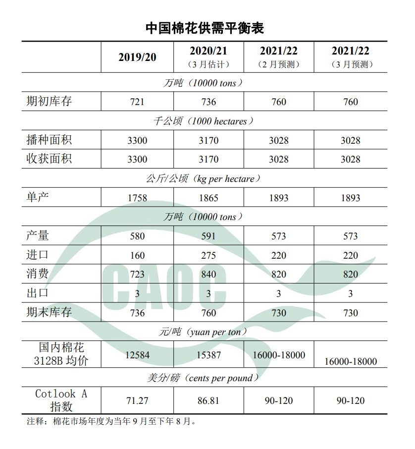 本月對(duì)2021/22年度棉花供需形勢(shì)預(yù)測(cè)與上月保持一致。國(guó)內(nèi)方面,下游紡織企業(yè)訂單多以小批量為主,市場(chǎng)對(duì)后市行情普遍持謹(jǐn)慎態(tài)度。皮棉現(xiàn)貨成交依然緩慢,據(jù)國(guó)家棉花監(jiān)測(cè)系統(tǒng)數(shù)據(jù),截至3月3日全國(guó)皮棉銷售進(jìn)度為39.3%,同比降34.7%。受地緣政治風(fēng)險(xiǎn)影響,歐洲經(jīng)濟(jì)復(fù)蘇進(jìn)程受阻,全球棉花消費(fèi)不確定性增加,國(guó)內(nèi)外棉價(jià)仍將高位震蕩,價(jià)格預(yù)測(cè)區(qū)間保持不變。