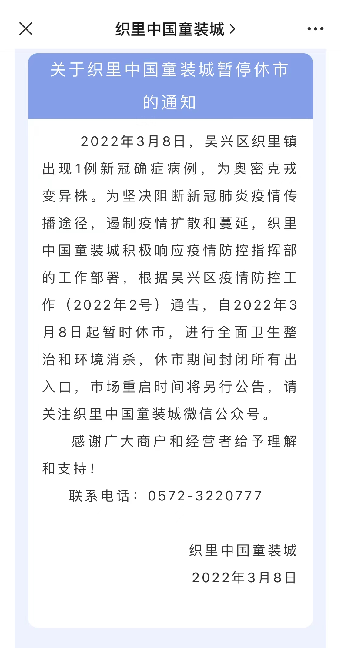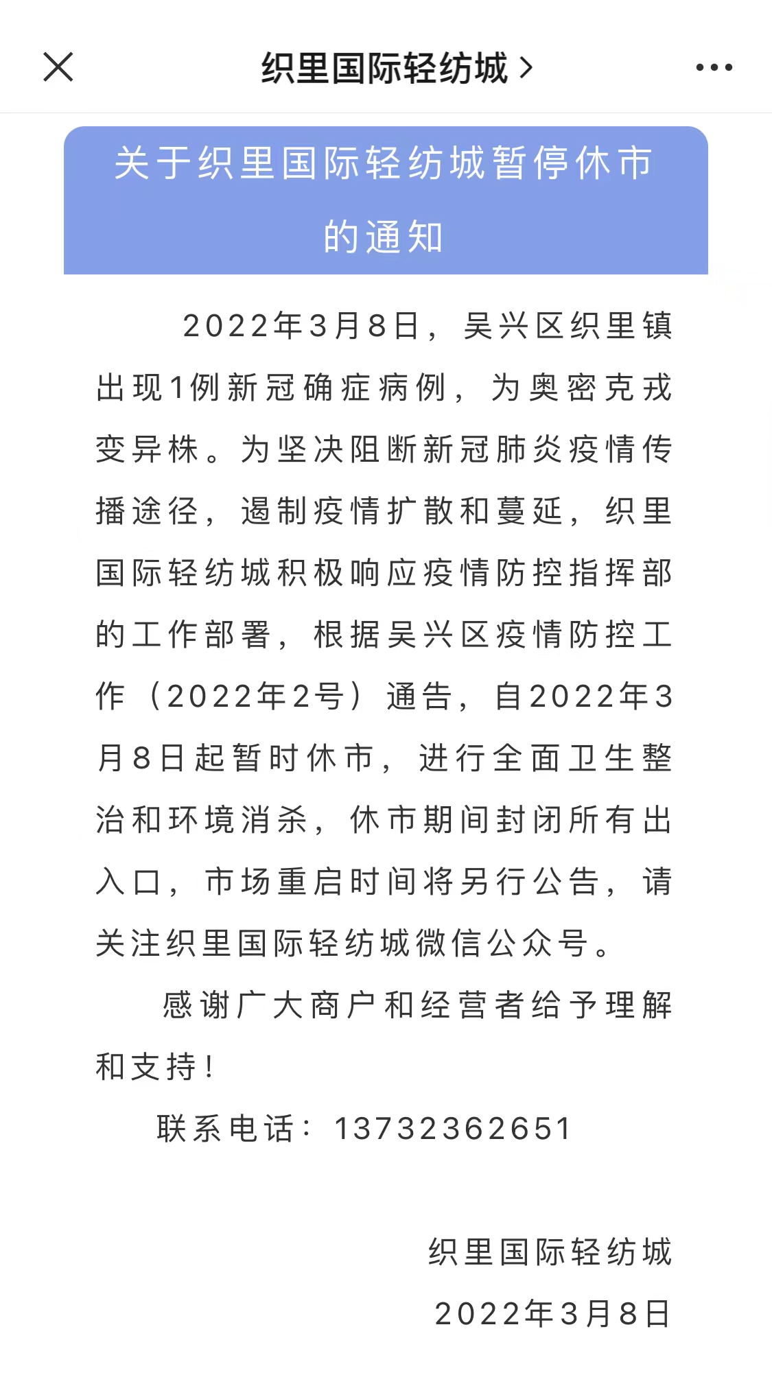 吳興區(qū)新冠肺炎疫情防控工作通告,又一紡織服裝重鎮(zhèn)受到疫情影響!前有東莞大朗羊毛交易中心關(guān)閉還沒恢復(fù),后有杭州四季青服裝街區(qū)關(guān)閉,恢復(fù)待定!湖州織里中國童裝城、織里國際輕紡城陸續(xù)發(fā)布暫停休市的通知。