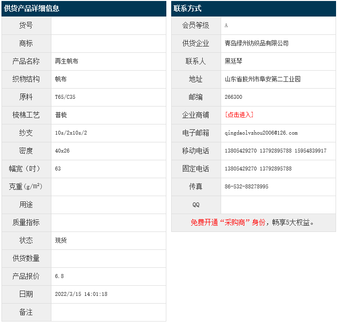 3月15日,青島綠州紡織品有限公司滌棉再生帆布T65/C35 10/2x10/2 40x26 63",報(bào)價(jià)為6.8元/米,實(shí)際成交價(jià)以協(xié)商為準(zhǔn)。[點(diǎn)擊查看詳情]