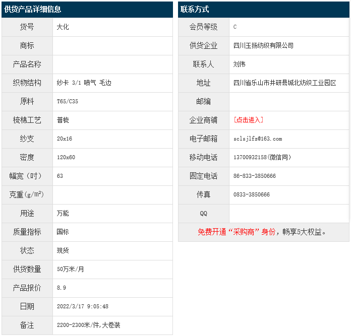 3月17日,四川玉揚紡織有限公司大化滌棉紗卡T65/C35 20x16 120x60 63" 3/1 噴氣 毛邊,報價為8.9元/米,實際成交價以協(xié)商為準。[點擊查看詳情]
