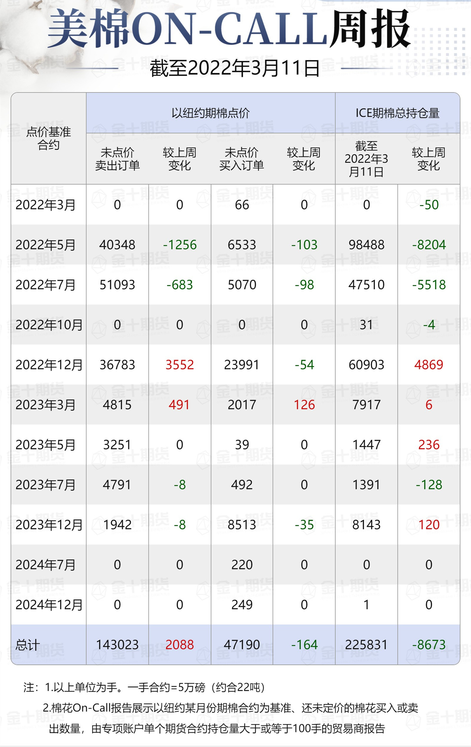 ①美棉On-Call未點(diǎn)價(jià)賣出訂單143023手,環(huán)比增加2088手;未點(diǎn)價(jià)買入訂單47190手,環(huán)比減少164手;