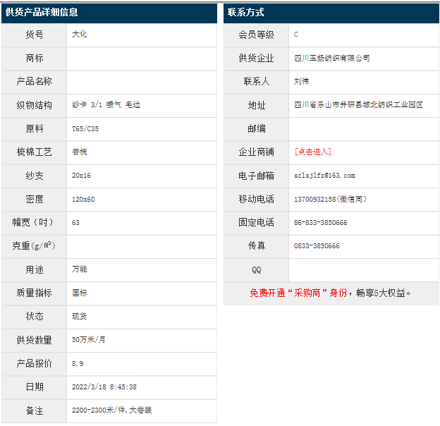 3月18日,四川玉揚(yáng)紡織有限公司大化滌棉紗卡T65/C35 20x16 120x60 63" 3/1 噴氣 毛邊,報(bào)價(jià)為8.9元/米,實(shí)際成交價(jià)以協(xié)商為準(zhǔn)。[點(diǎn)擊查看詳情]